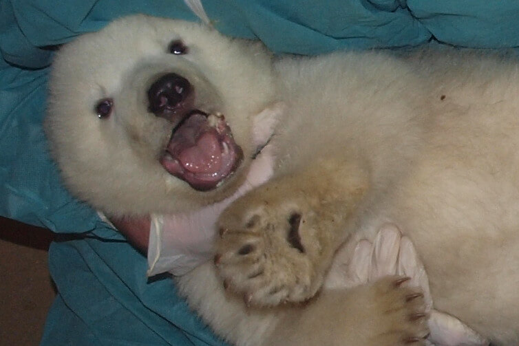 Mittwoch vergangener Woche hat Zootierärztin Dr. Pia Krawinkel das kleine Eisbärmädchen untersucht. Das noch namenlose Jungtier wurde gewogen, bekam eine Wurmkur als Prophylaxe und wurde gegen die Infektionskrankheit Leptospirose geimpft. In vier Wochen erfolgt die zweite Impfung. Dann dauert es etwa zwei Wochen, bis sich der komplette Impfschutz aufgebaut hat.