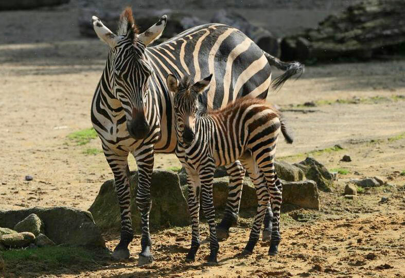 Die 14-jährige Zebrastute Farida kümmert sich vorbildlich um ihr Jungtier. Das jüngste Mitglied der Herde wurde von Pflegern auf den Namen Simion getauft. Der Name stammt aus dem Arabischen und bedeutet „Gott hat gehört“ oder „der Stupsnasige“.